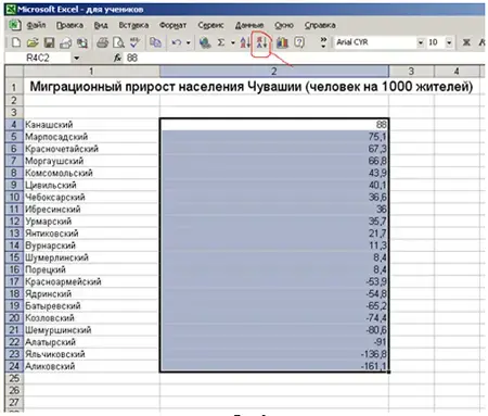 Проведем сортировку данных. Для этого выделим диапазон данных R4C2, как показано на рис.2 и в строке меню выберем задачу сортировать по убыванию, выделено красным цветом на рис.2. Как видно из рис. 2, данные выстроятся в следующем порядке.