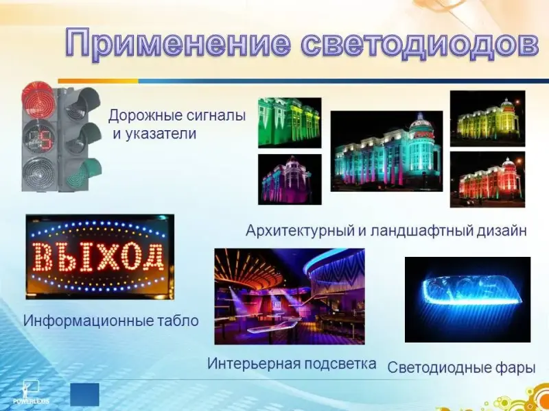 Применение светодиодов можно разделить на две категории: информационные табло и освещение. Прямой светодиодный свет широко используется для передачи информации, например: сигнальные устройства, информационные табло, полноцветные видео дисплеи, дорожные светофоры и знаки, индикаторы поворота транспортных средств. В освещении применяются светодиоды для того, чтобы осветить поверхность или объект. Примеры включают использование светодиодов в фонариках, интерьерную подсветку, освещение фасадов зданий, подсветку дисплеев и клавиш мобильных телефонов, освещение в автомобилях, уличное освещение. (Слайд 4)