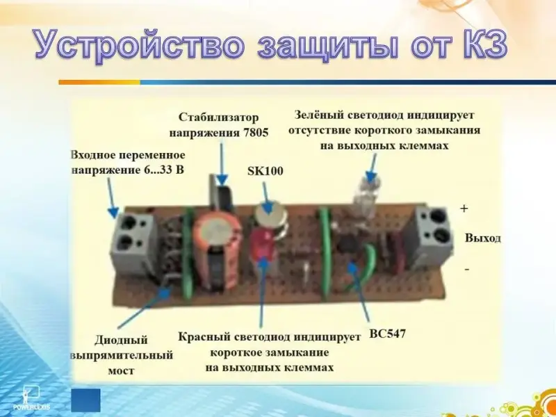 Иногда в электронных схемах присутствует необходимость запитывать от источника питания дополнительные устройства. Во время короткого замыкания данное устройство позволяет отключить дополнительную нагрузку. Восстановление функционирования позволяет источнику возобновить нормальную работу. Наличие или отсутствие короткого замыкания индицируется двумя светодиодами.