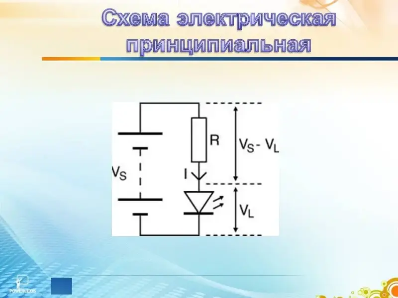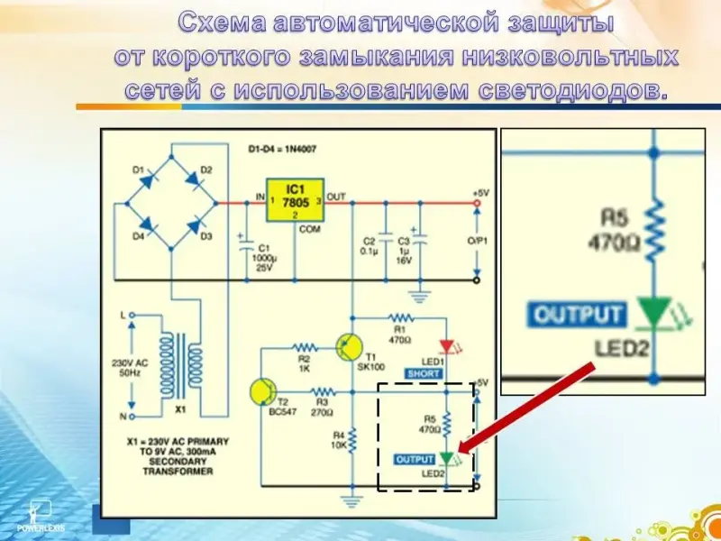 Схема устройства защиты источника питания от короткого замыкания представлена на экране. Рассмотрим небольшой участок схемы, включающий светодиод и светодиодный резистор. (Слайд 6)