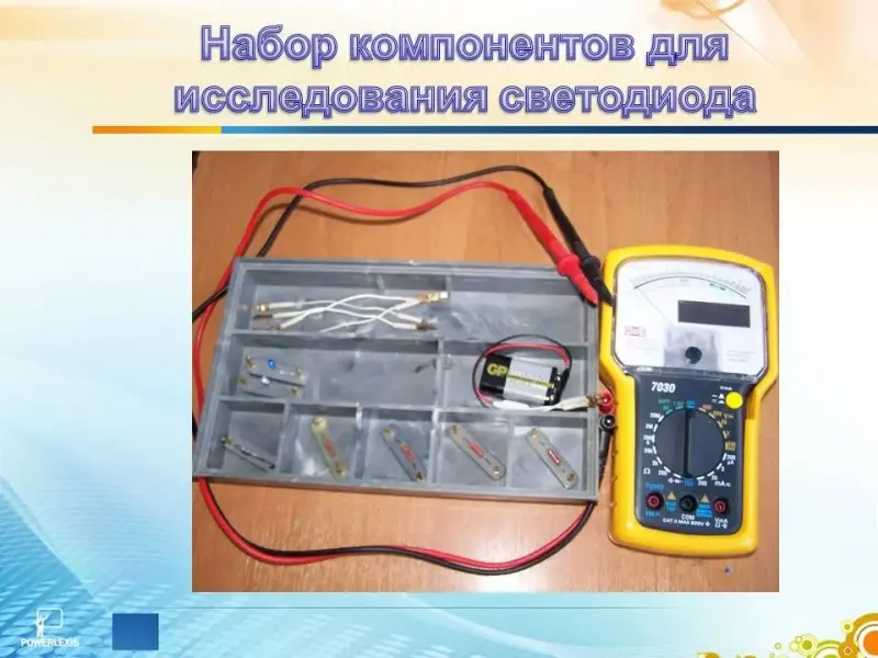 Ребята, мы будем работать малыми группами, по два человека. Обратите внимание на наборы, находящиеся перед Вами. В них входят набор сопротивлений (резисторов), цветной и белый светодиод, соединительные провода, измерительный прибор - мультиметр и источник питания - батарейка типа "Крона". (Слайд 7)