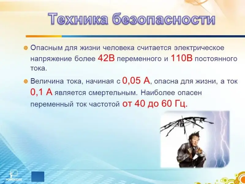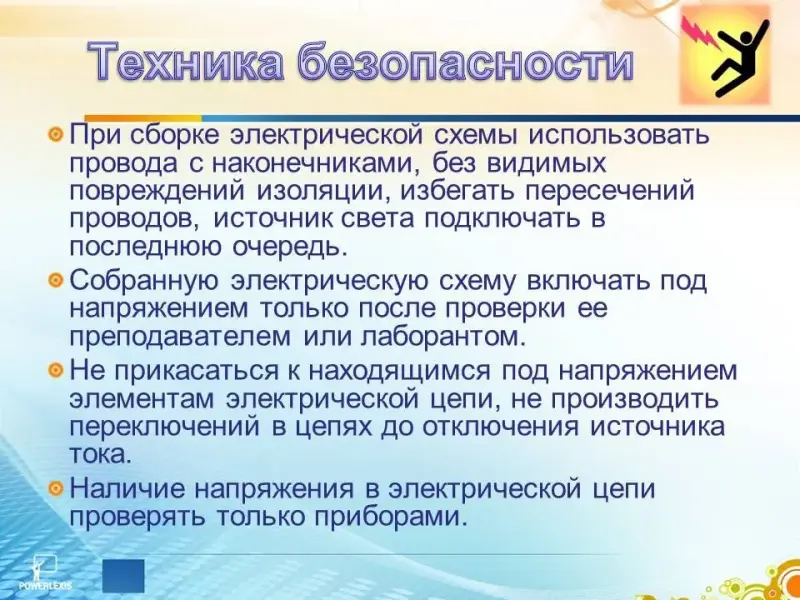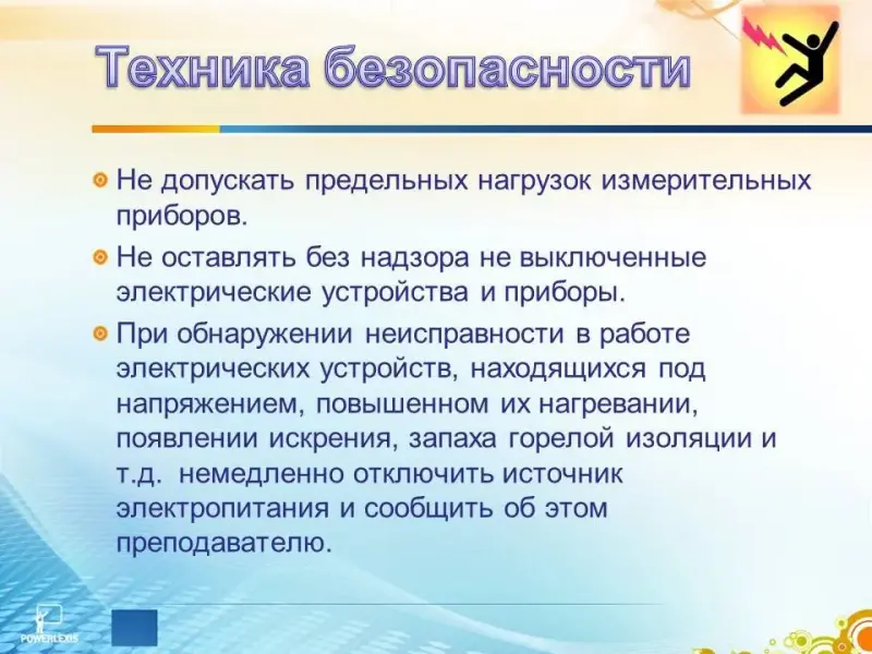Сейчас условия нашей работы абсолютно безопасны, так мы работаем с напряжение до 12 Вольт и силой тока до 2 сотых Ампер. Но правила техники безопасности соблюдать необходимо в любом случае. (Слайд 10)