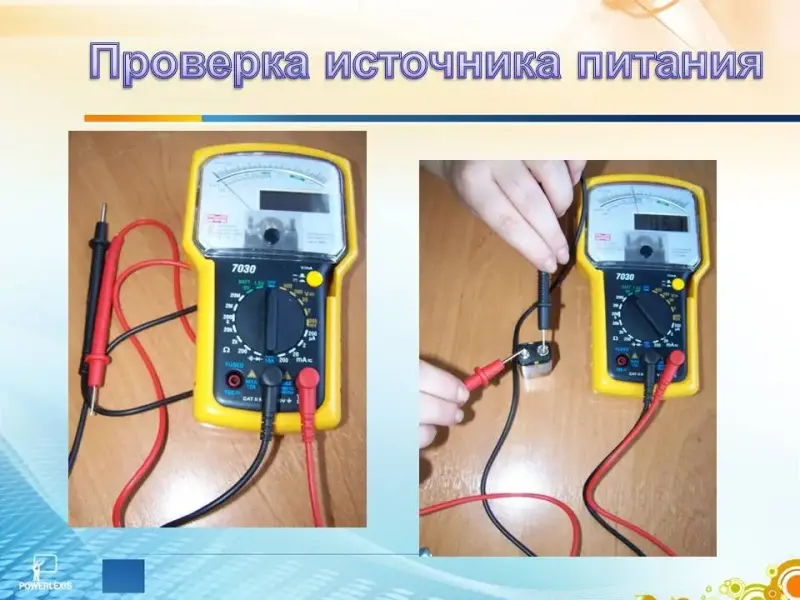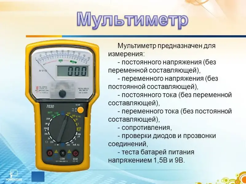 Измеряем постоянное напряжение, проверяем батарейку типа Крона. Для этого воспользуемся мультиметром. Им можно измерять различные величины, в том числе и постоянное напряжение. (Слайд 11)
