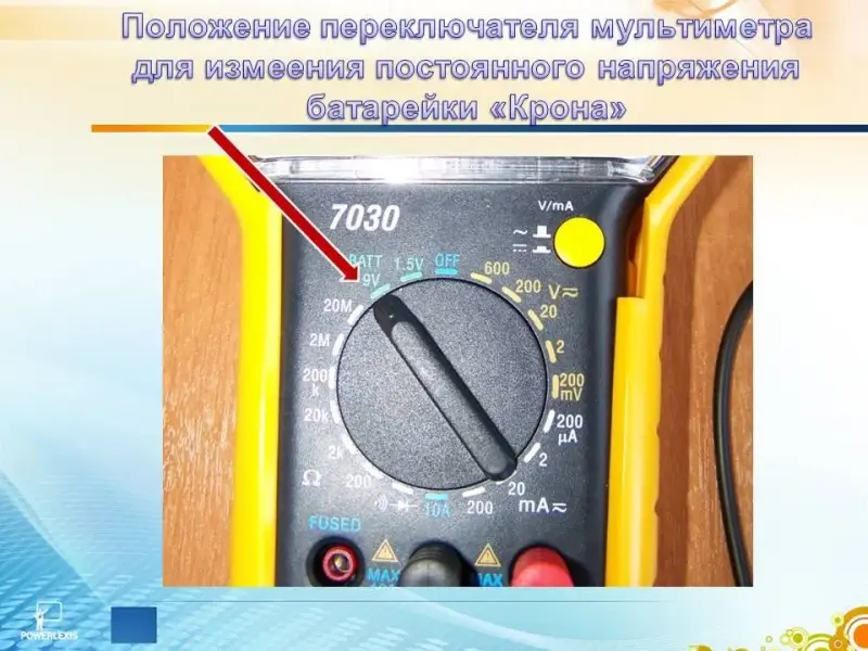 Для этого выбираем соответствующий предел измерения переключателем, 9 вольт в этом, конкретном случае, вполне подходит. На будущее, если величина неизвестно даже примерно, начинаем измерение с максимальной величины, иначе прибор может выйти из строя. (Слайд 12)