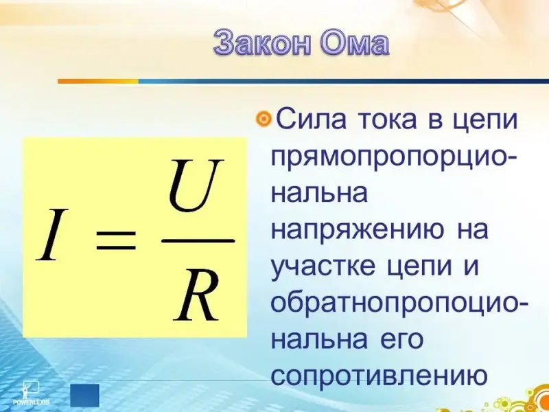Закон Ома - это физический закон, с помощью которого вы можете определить взаимозависимость напряжения (U), силы тока (I) и сопротивления (R). Суть эго проста: сила тока в проводнике прямо пропорциональна напряжению между концами проводника, и обратно пропорциональна сопротивлению проводника. (Слайд 15)