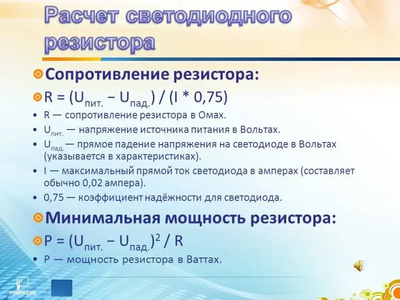 Произведем расчет минимальной мощности светодиодного резистора по формулам на доске. (Слайд 16)