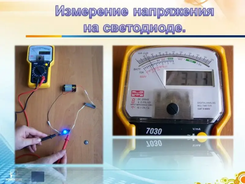 Подключаем мультиметр параллельно светодиоду. И записываем результат в таблицу измерений. (Слайд 23)