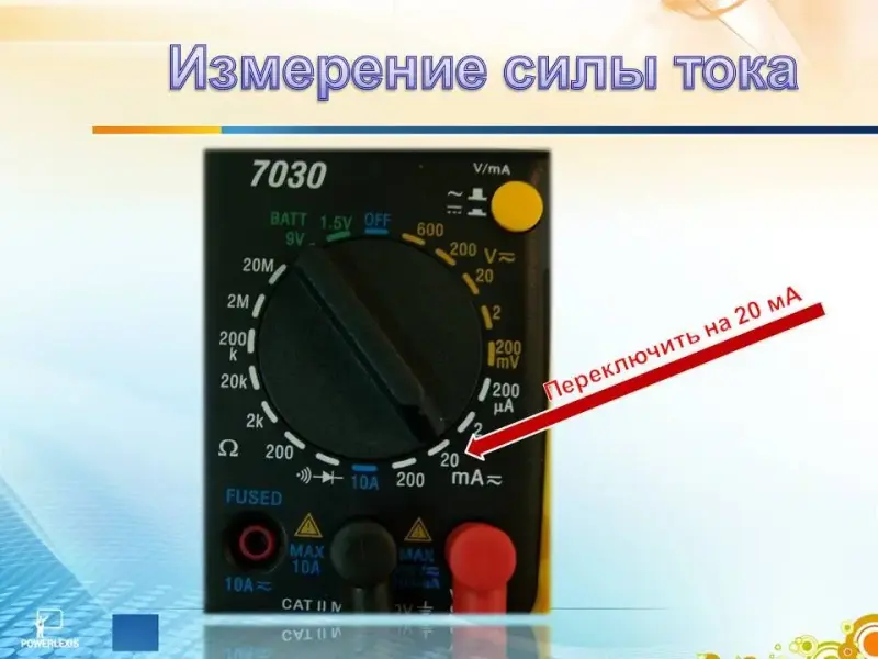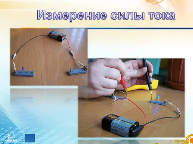 Осталось последнее измерение. Теперь разрываем цепь межу сопротивлением и светодиодом, включаем измерительный прибор и измеряем протекающий в цепи ток. Мультиметр в случае измерения силы тока должен быть подключен последовательно. (Слайд 24, 25)