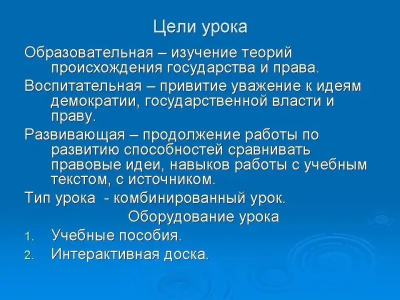 | Развивающая цель | продолжение работы по развитию способностей сравнивать правовые идеи, навыков работы с учебным текстом, с источником, аргументировать свою точку зрения. |