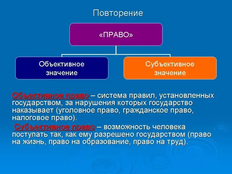 Учитель проводит фронтальный опрос пройденного материала; демонстрируются на экране доски схемы, помогающие вспомнить ответы на вопросы (определение и виды права, определение и