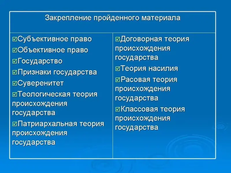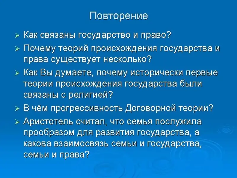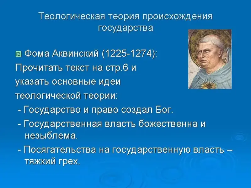 | Учитель даёт задание прочитать определение теологической теории происхождения государства на стр. 6 и записать основные идеи; демонстрирует на доске основные идеи. | Слайд №7 | Слушают учителя, работают с текстом, записывают основные идеи. |