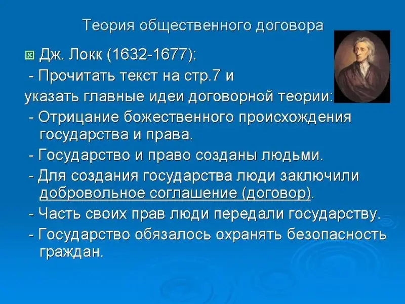 | Учитель даёт задание прочитать определение договорной теории происхождения государства на стр. 8 и записать основные идеи; демонстрирует на доске основные идеи. | Слайд №9 | Слушают учителя, записывают в тетрадь идеи. |