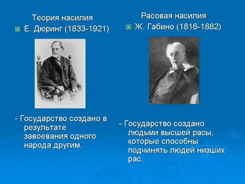 | Учитель демонстрирует таблицу информацией о расовой теории и теории насилия; просит привести примеры из истории. | Слайд № 10 | Слушают учителя, записывают в тетрадь таблицу, приводят примеры и обсуждают их. |