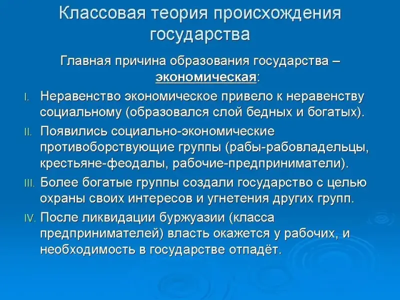 | Учитель демонстрирует на доске основные положения классовой теории происхождения государства; комментирует записи. | Слайд №12 | Слушают учителя, записывают основные положения теории. |