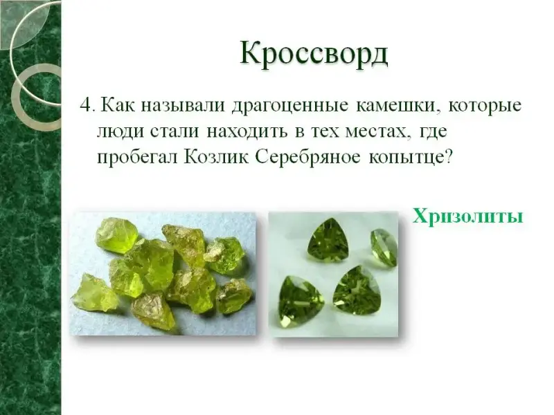 4. Как называли драгоценные камешки, которые люди стали находить в тех местах, где пробегал Козлик Серебряное копытце? (Хризолиты)