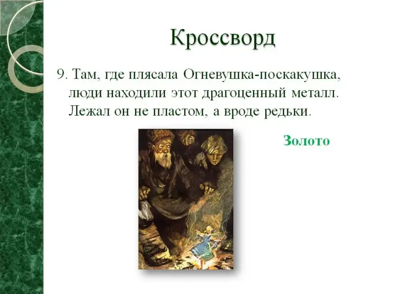 9. Там, где плясала Огневушка-поскакушка, люди находили этот драгоценный металл. Лежал он не пластом, а вроде редьки. (Золото)
