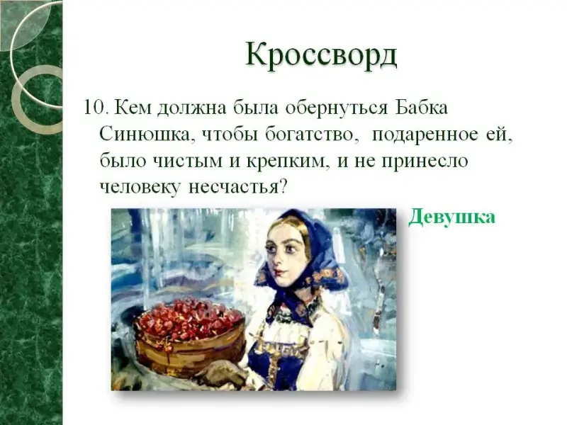 10. Кем должна была обернуться Бабка Синюшка, чтобы богатство, подаренное ей, было чистым и крепким, и не принесло человеку несчастья. (Девушка)