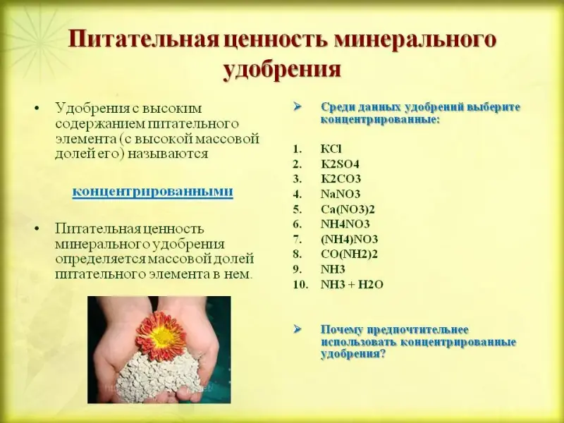 Учитель: Рассмотрим питательную ценность минеральных удобрений.