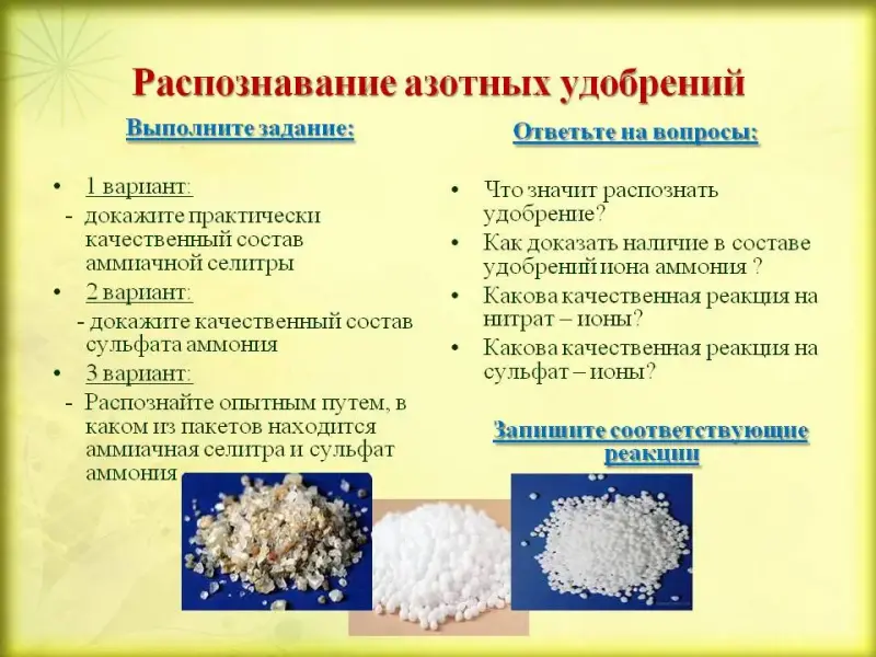 - 3 вариант: распознайте опытным путем, в каком из пакетов находится аммиачная селитра и сульфат аммония
