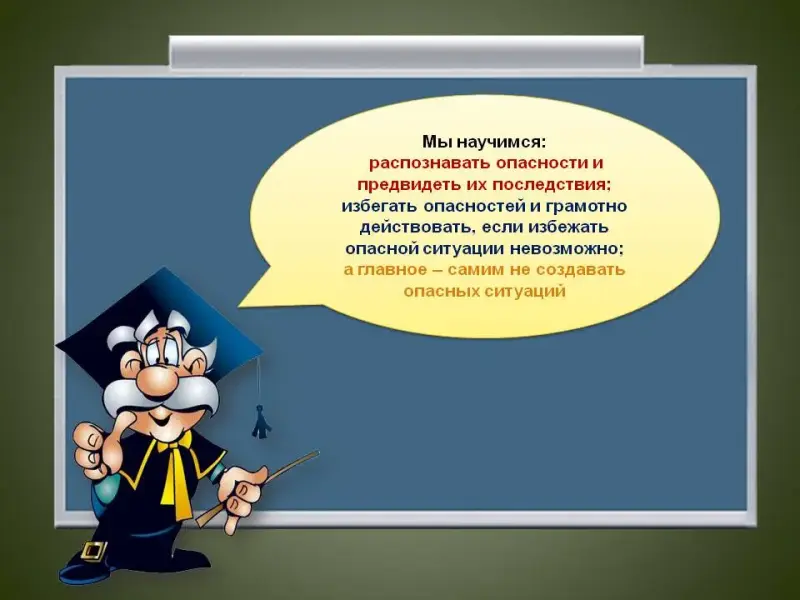 3 слайд: Мы научимся: распознавать опасности и предвидеть их последствия; избегать опасностей и грамотно действовать, если избежать опасной ситуации невозможно; а главное - самим не создавать опасных ситуаций 4 слайд: Счастливого вам пути к познанию мира, себя в нем, к здоровью и здоровому образу жизни!!! |