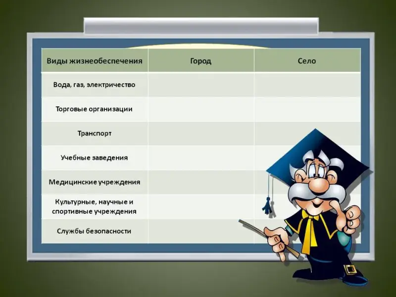 - Сейчас мы с вами заполним таблицу (Раздаточный материал) «Жизнеобеспеченность человека в городе и на селе» и попытаемся сделать вывод - кто больше всего зависит от слаженности работы всех систем жизнеобеспечения городской житель или сельский? Слова учителя: Так какой вывод мы можем сделать?