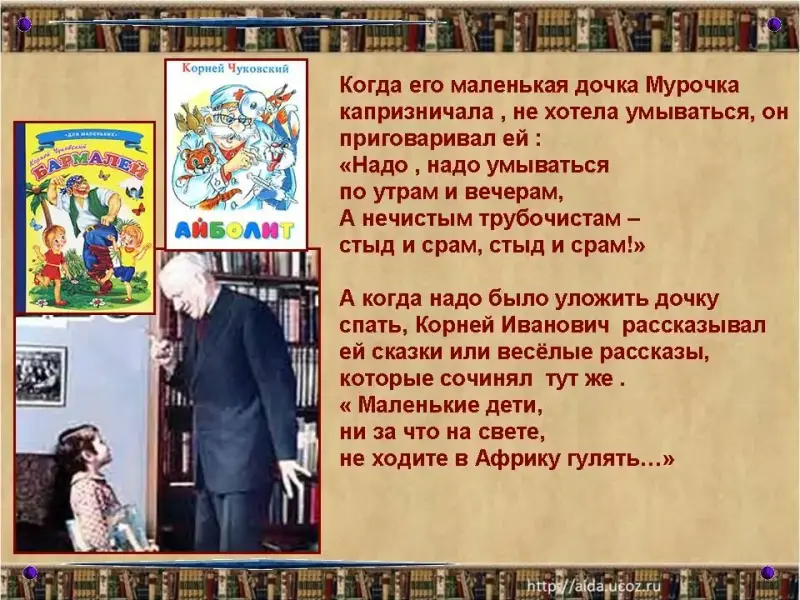 Однажды он услышал громкий плач младшей дочери. Слёзы текли в три ручья. Она не хотела мыться (слайд). Чуковский взял её на руки и неожиданно стал рассказывать.