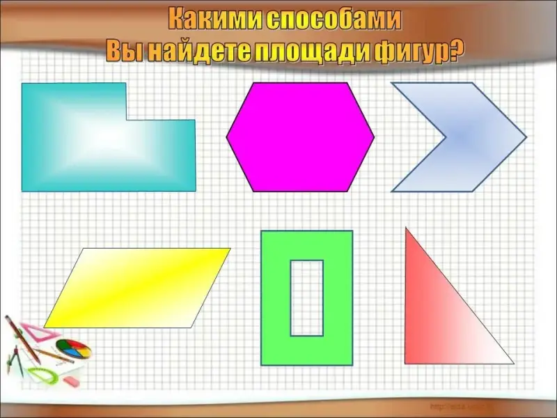Оборудование: модели единиц площади (1см2, 1дм2, 1м2) на стенах класса, модели сложных фигур на листах А2, индивидуальные листы, презентация, листы А4, фломастеры.