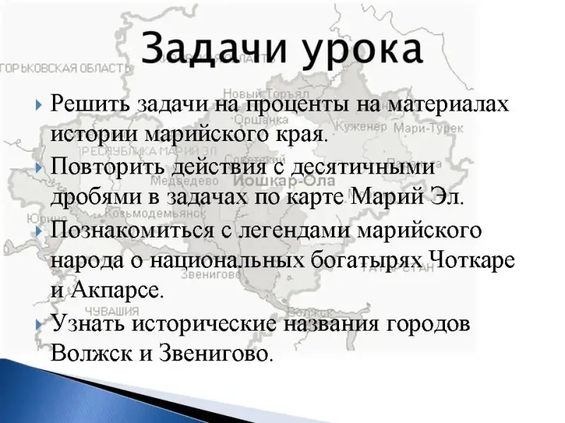 Учитель математики. - Из математики мы с вами вспомним, как решаются текстовые задачи на "ЧАСТЬ, ДОЛЮ, ЦЕЛОЕ" и способы их решения, повторим правила действий над десятичными и обыкновенными дробями в форме самостоятельной работы, во время устного счёта решим текстовые задачи на определение доли числа в процентах. Из ИКН вы узнаете о национальных марийских героях, об истории основания городов Звенигово и Волжск. Вы познакомитесь с некоторыми статистическими данными нашего края.