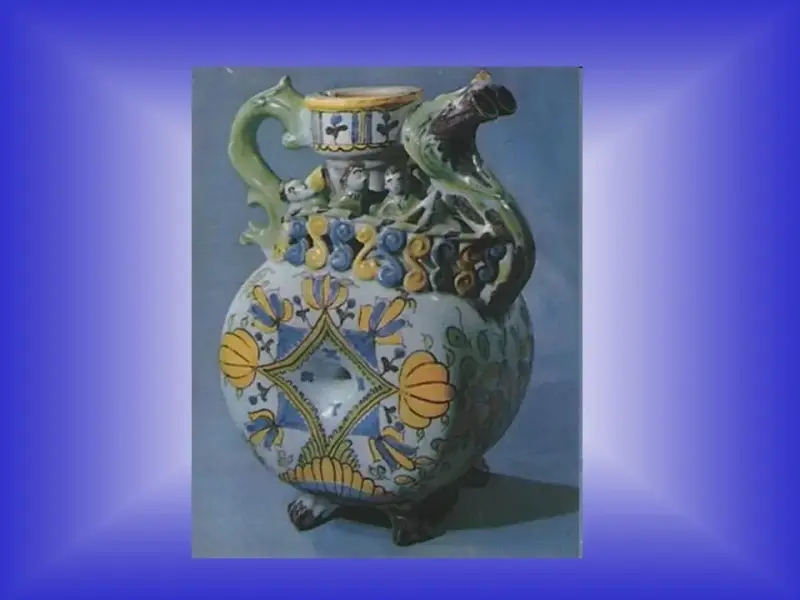 Специально для изготовления аптекарской посуды было доставлено 15 возов глины. Мастера уже осваивали новый вид посуды - "алхимический". Дети тоже помогали своим родителям, а из остатков глины лепили простые игрушки. Чтобы игрушки были красивыми, нарядными - расписывали их красками. Да и мастера были такие выдумщики, посуду украшали так искусно, ручки - веточки - завитки, на крышечке птичка, и многое другое...да еще и затейливо ярко раскрашено. Разноцветная посуда получила название "майолика". (Слайд)