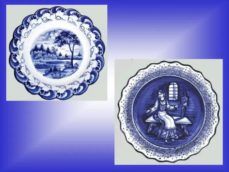 3. В 1749 году знаток глин Д.И. Виноградов и М.В.Ломоносов дали самую высокую оценку гжельским глинам, смешав оренбургскую и гжельскую глины, получили настоящий чистый и белый порцелин (фарфоровую массу). В 1800-1804 гг. основан первый фарфоровый завод. Фарфоровые и фаянсовые изделия отличаются тонкостью стенок и белизной. Способы украшения их разнообразны.