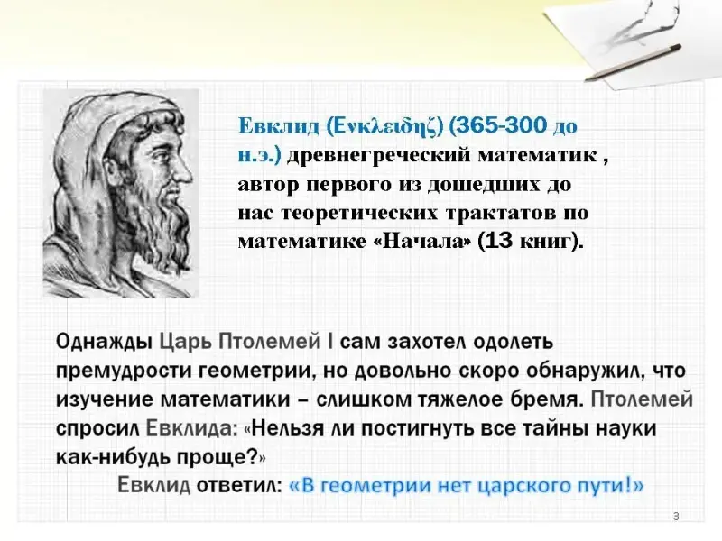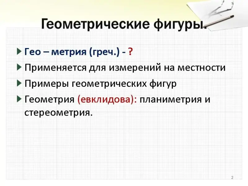 Водная лекция об истории геометрии. Почему одна из наиболее древних наук? Что означает слово "геометрия"? Перечисление учениками известных им геометрических фигур. Деление перечисленных фигур на группы -> разные разделы геометрии. Исторические сведения о Евклиде и самом известном его сочинении.
