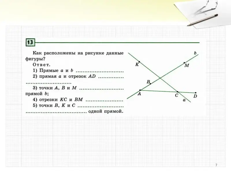 - Отмечают точки, лежащие и не лежащие на прямых, обозначают их. Далее учитель показывает знак пересечения и принадлежности, записывают утверждения с помощью этих знаков на математическом языке; формируются ассоциации для запоминания этих знаков.