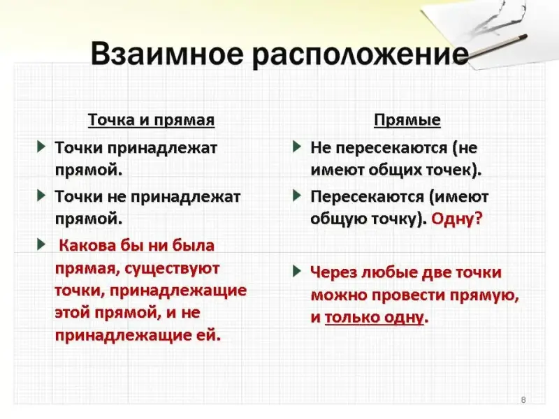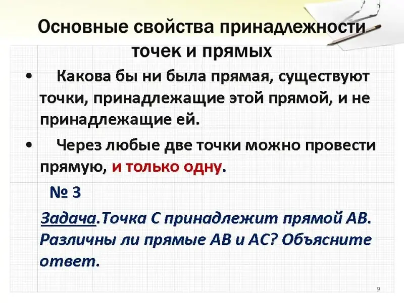- Развивающая: применять основные свойства расположения точек и прямых при решении задач; выделять основные свойства новых объектов; систематизировать полученную информацию; повышение культурного уровня через знакомство с историей науки.