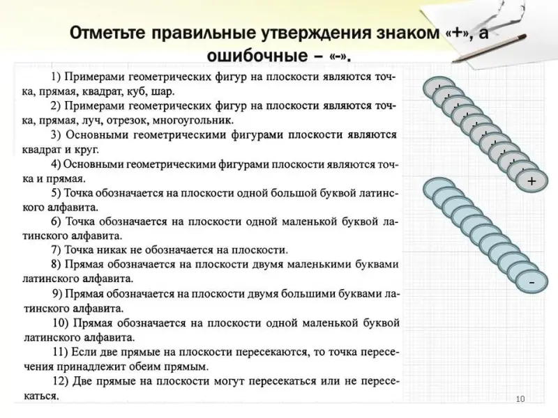 Первичный контроль знаний. У каждого учащегося в тетради приклеен такой же слайд. Один ученик работает на доске. Отмечает перетаскиванием "+" и "-" , остальные работают в тетради. Проверка отвечающего у доски.
