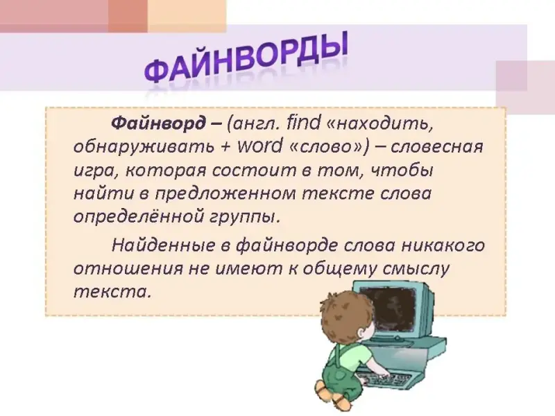 Файнворд - (англ. find "находить, обнаруживать + word "слово") - словесная игра, которая состоит в том, чтобы найти в предложенном тексте слова определённой группы. Найденные в файнворде слова никакого отношения не имеют к общему смыслу текста.