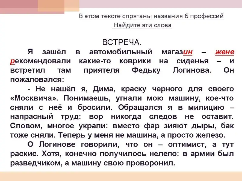 В тексте спрятаны названия 6 профессий. Найдите эти слова.
