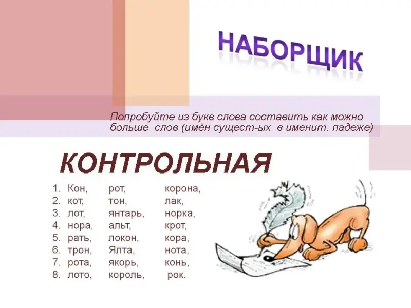 Попробуйте из букв слова составить как можно больше слов (имён сущест-ых в именит. падеже).
