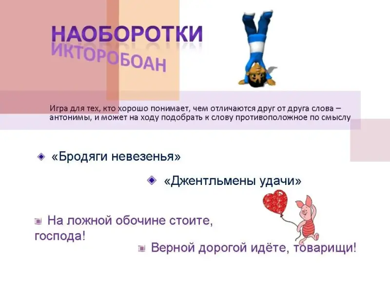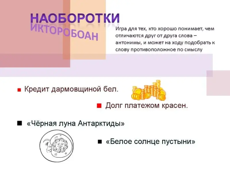 Игра для тех, кто хорошо понимает, чем отличаются друг от друга слова - антонимы, и может на ходу подобрать к слову противоположное по смыслу