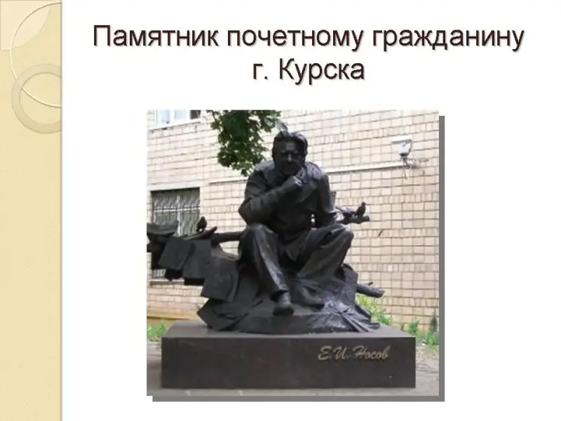 Проза Е. Носова - это проза писателя, органически воспитанного на традициях народной культуры и отечественной классики, в которых польза и красота, чёткое жизненное намерение и бессознательное очарование жизнью гармонично уживаются, дополняя друг друга.