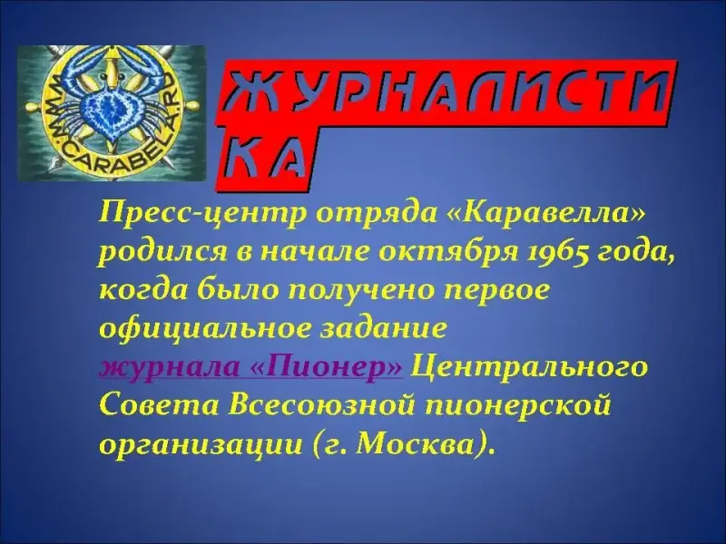 Ведущий 2: В 1961 году Владислав Крапивин организовал детский отряд "Каравелла". В отряде ребята занимались журналистикой. Морским делом, фехтованием.