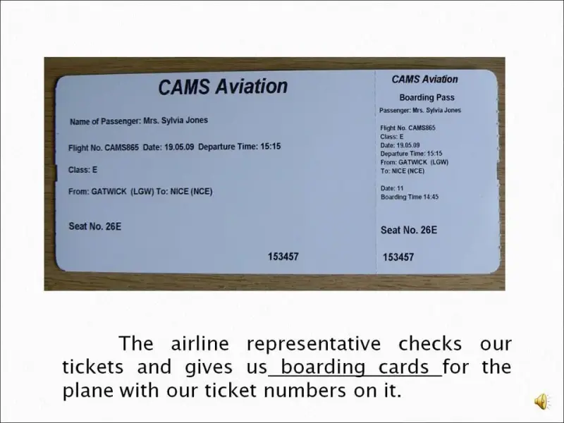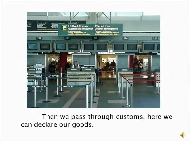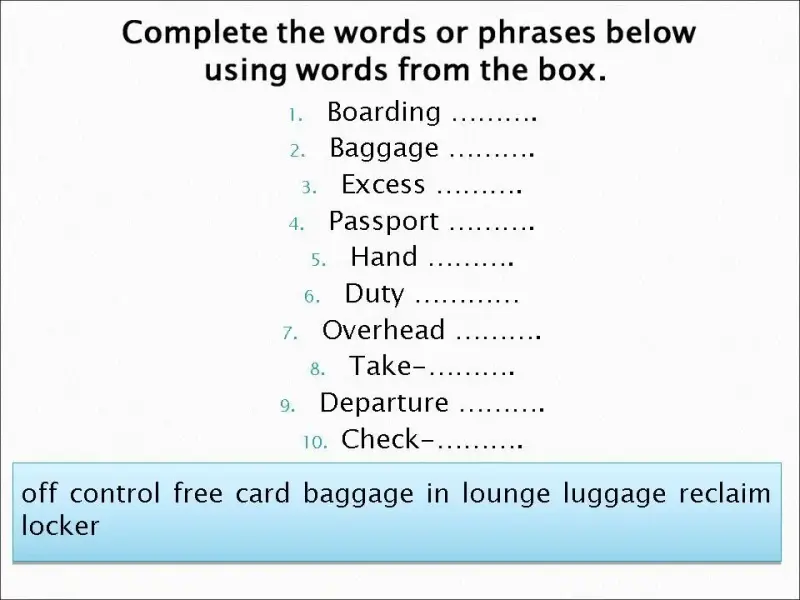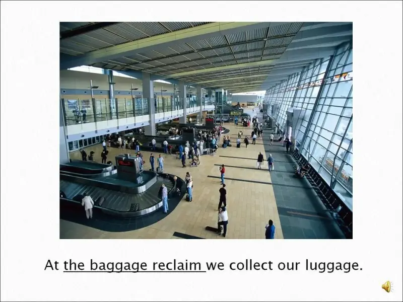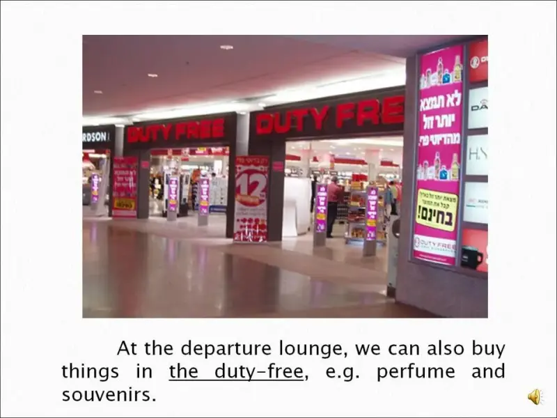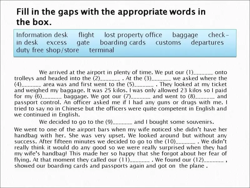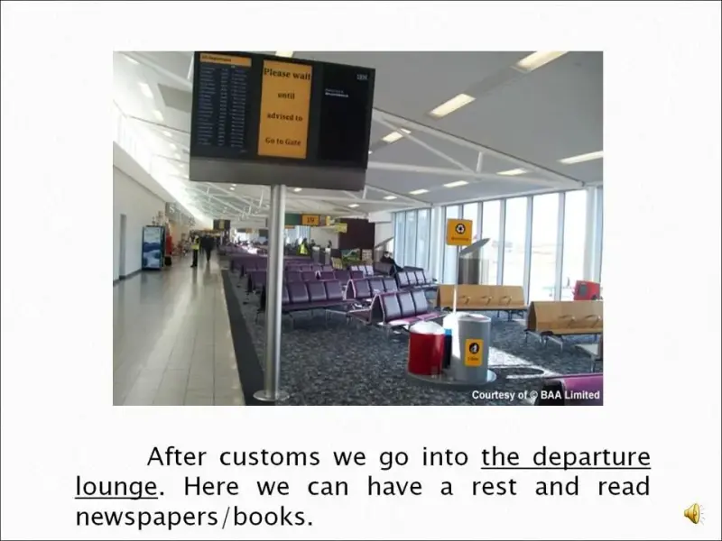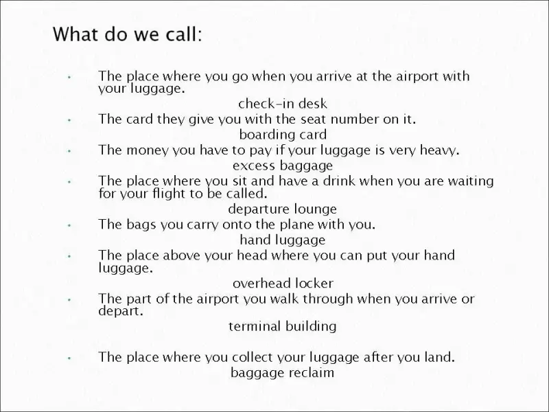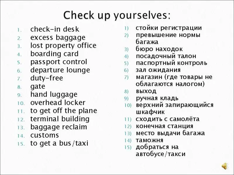 Активный словарь: baggage, boarding card, check-in desk, customs, departure lounge, duty free store, flight, gate, terminal building