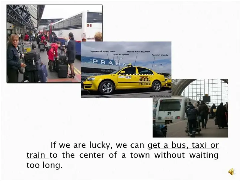 Let's travel by plane!(slide) Look at the slide! The theme of our lesson is "Air travel" Listen to the word and say after the announcer! Now we are going to listen to the text about the air travel. The text is divided into parts. Listen to the first part of the text very attentively. Try to get the meaning of the underlined words. Then write them down into your exercise books and translate. Now answer the question, please! |