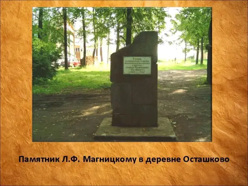 Уже в наше время в Осташкове в память о своем знаменитом земляке Магницкому установили небольшой памятник.