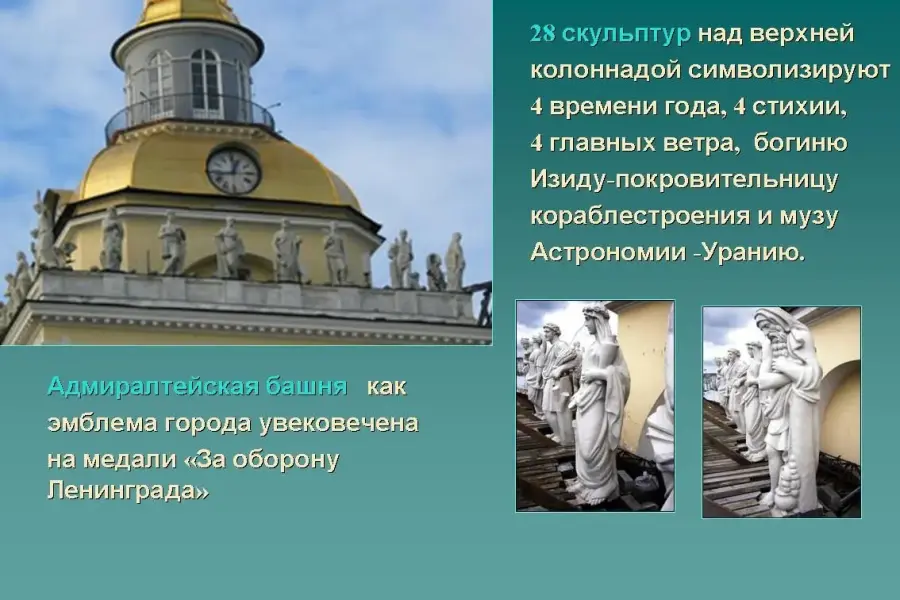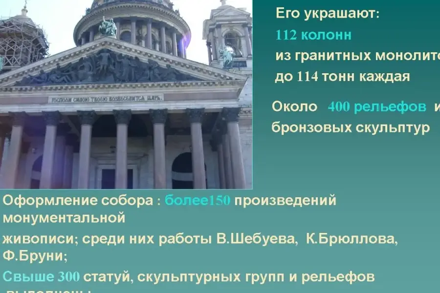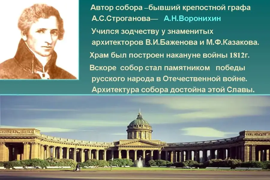 Значительный вклад в архитектуру Петербурга внесли А.Захаров (Адмиралтейство), А.Воронихин(Казанский собор, здание Горного института, К.Росси (Русский музей, Дворцовая площадь и Генштаб, ансамбль Мариинского театра, здание Сената и Синода О..Монферран (Иссакиевский Собор, Александровская колонна)