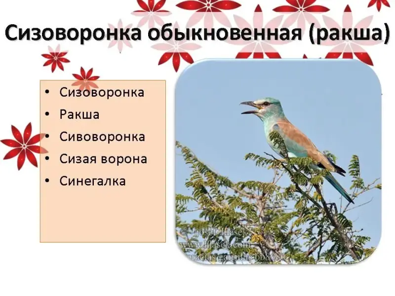 Сизоворонка, синегалка, "кёк карга" - "синяя ворона" - все свои имена она получила за облик схожий с вороной и за преобладание синего и голубого цвета в оперении.