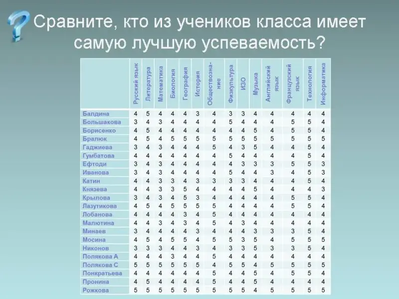 Или другой пример. Имея данные по успеваемости класса за четверть, надо выполнив сравнение, подвести итог. (Слайд 3)