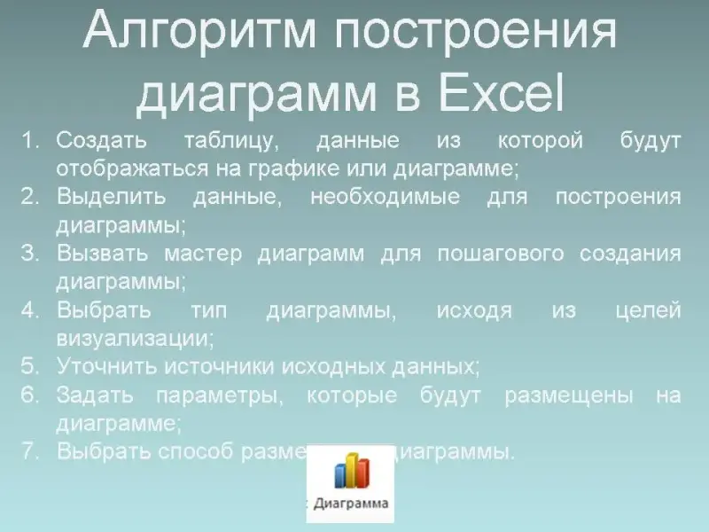 Учитель Рассмотрим алгоритм построения диаграмм. Для создания диаграмм в программе Excel существует Мастер диаграмм. Это работающее в диалоговом режиме средство, которое посредством использования пошаговых инструкций, размещаемых в диалоговых окнах, подскажет, что надо делать.