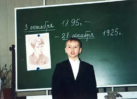 Ведущий 2 (Марченко Кристина): Сергей Александрович Есенин родился в селе Константиново Рязанской области, в крестьянской, зажиточной семье. Детство поэта прошло у родителей. "Среди мальчишек я был коноводом и большим драчуном и ходил всегда в царапинах" - вспоминал он о своем детстве.