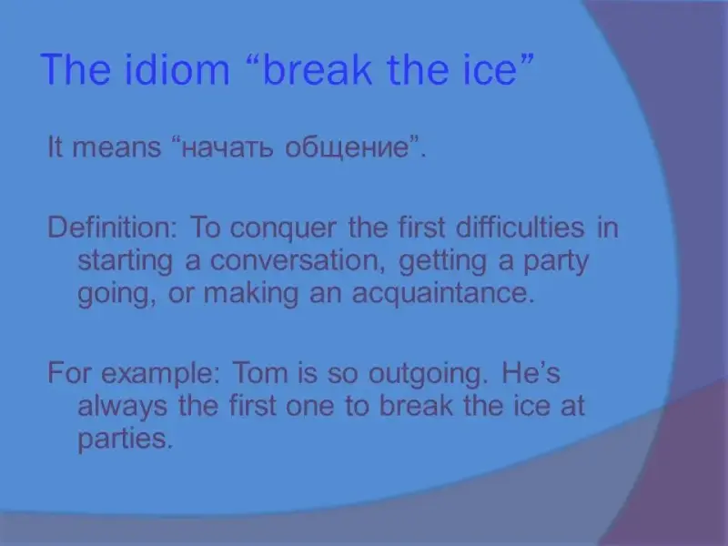 Организует работу в парах для обсуждения цели автора и закрепления лексических единиц по теме " Общение". Задает вопрос. Let's discuss in pairs. What is the author's purpose, the reason to write this text? From my point of view, the author's purpose is to inform us about how we can break the ice. |
