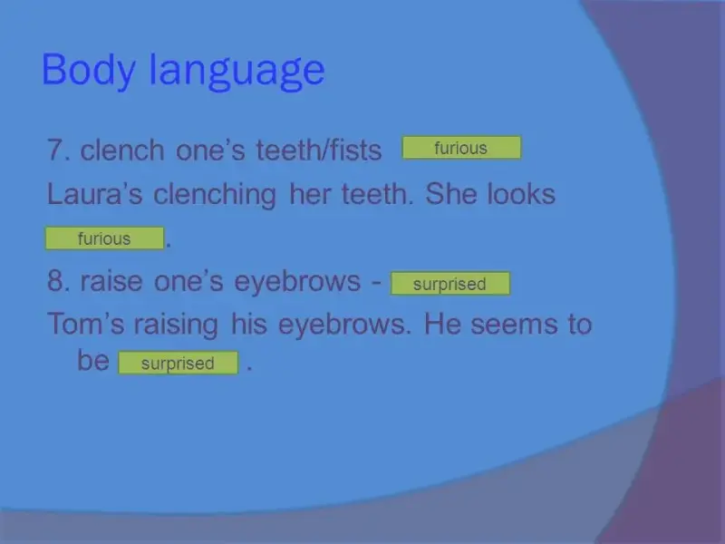 Введение новой лексики по теме "язык тела" (Слайд 13, 14). Предлагает учащимся выбрать слова из списка (описания чувств) и соединить их с действиями, которые изображены на картинках 1-8. The language of our body, I mean actions, can show our feelings. It is very important to know it when you meet new person. Some of the example you can see in Ex 9 p 11. Your task is to choose the word from the list and match it to the picture. Then make sentences as in the example. |